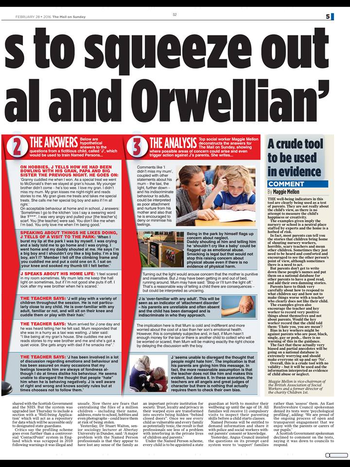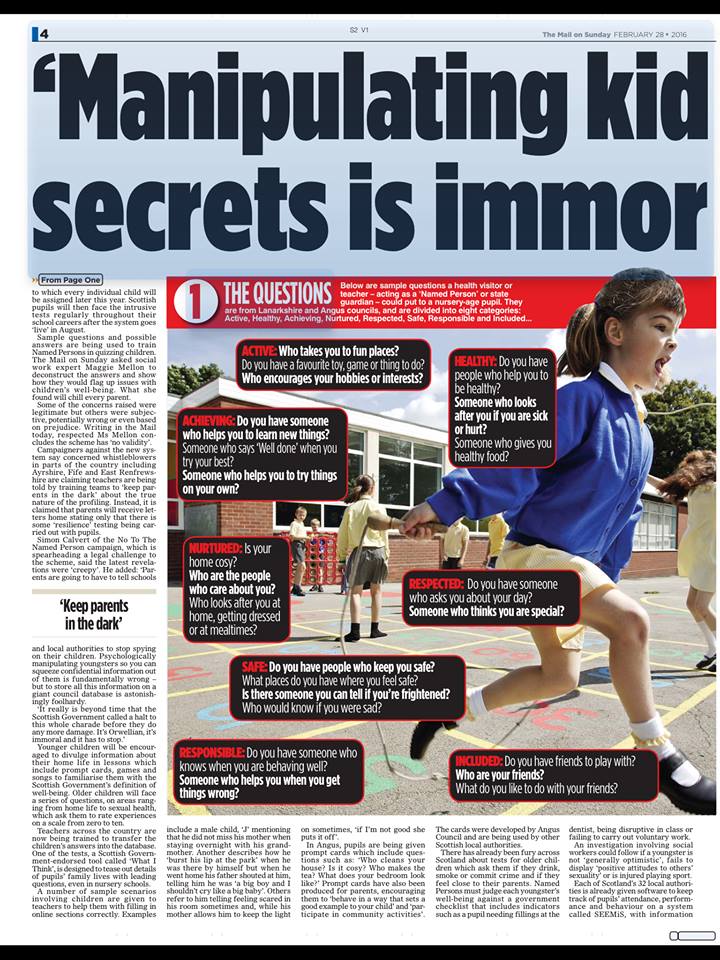 Yesterday’s Mail on Sunday carried a major story in both its UK and Scottish editions about the covert psychological profiling of pupils in our schools and even nurseries. When I last looked, it had been shared 4300 times and there has been wall to wall outrage on social media. The ‘What I Think’ tool has long been in use, along with other equally disturbing material that can be found on the GIRFEC in Lanarkshire website, and for some years teachers have been instructed to administer ‘surveys’ to pupils without their parents’ knowledge or consent in various guises, including E2S and ChildrenCount. This scandal was extensively reported by Kenneth Roy in the Scottish Review, who also exposed the Young Scot card’s propensity for data stealing, but the ICO sat on his hands then too, and complaints were ignored.